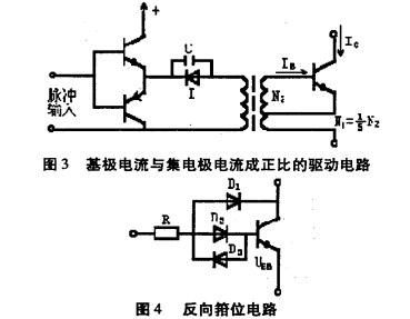 为防止因基极电流太大而增加开关管的存储时间,可采用图4的反向箱位电路。这种电路,当基极电流上升到使开关管的饱和压降低于Uw时,二极管D,导通,阻止基极电流的进一步增加,可有效地防止过驱动。