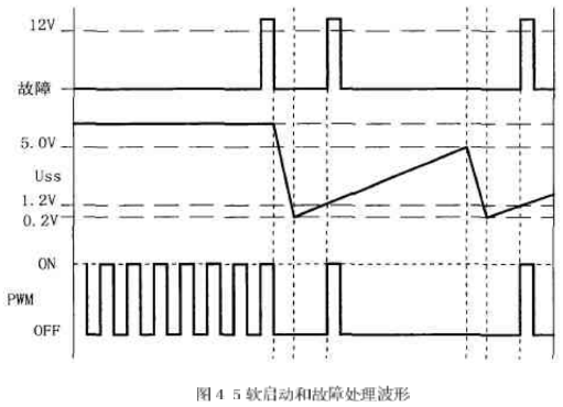 软启动和故障处理波形如图4-5所示。软启动是通过软启动(SOFT,START)脚的外接电容实现的。接通电源后,软启动脚外接电容放电,该脚处于低电平,误差放大器输出低电平,开关电源无输出电压。当9uA的内部电流源给软启动脚外接电容充电时,误差放人器输出电压逐渐升高,直到闭环调节功能开始T.作,开关电源输出电压逐渐升高到额定值。一旦限流(ILIM)脚的电平超过1.2V,故障锁存器置位,输出脚变为低电平;同时,软启动脚外接电容以250uA的电流放电。在软启动电容放完电后,限流脚电平降到1.2V以下时,故障锁存器就不输出脉冲。这时,故障锁存器复位,芯片开始软启动过程。