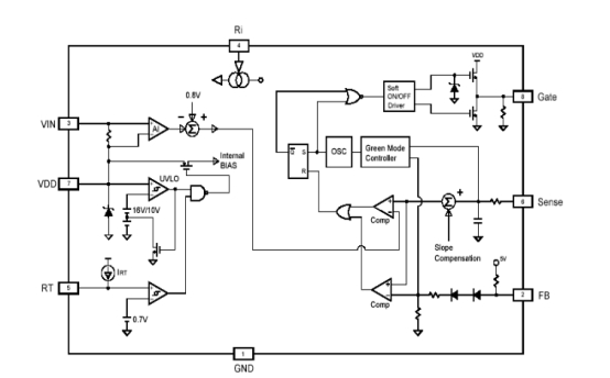 4.RI:参看设置端。经过连接一个电阻接地来为SG6841供应一个安稳的电流,改动电阻阻值将改动PWM的频率。