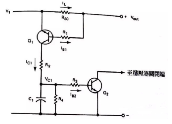 工作原理是:在正常的工作状况下,流入到Rsc上的Il不会产生很大的压降,那么就不会使Q1导通,若负载电流足够大就会在Rsc上产生电压,使Q1导通。若Q1在OFF装态时,而且Ic1=0时C1会全部放电掉,因而Q2也会处于OFF状态,假如Il电流逐步增加时,则Il*Rsc=VbeQ1+Ib1R1,此时会集电极会有电流Ic1流过,并有下面的时间常数将C1充电T=R2*C1,那么C1上的电压是:Vc1=Ib2R3+VbeQ2,为了使为了使电容器电压的负载效应减到最低值,我们可选用具有较高的HFE的达林凳管子来替代Q2,这样能够把基极电流限制在微安培,我门在选择电阻R4时要远远大于R3。这样当电流过载时,C1电容会快速放电。