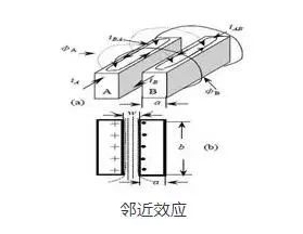 当两个相邻导体流过方向相反的电流时,相互之间会发生磁动势,则磁动势在对方导体中会发生涡流,引起损耗。