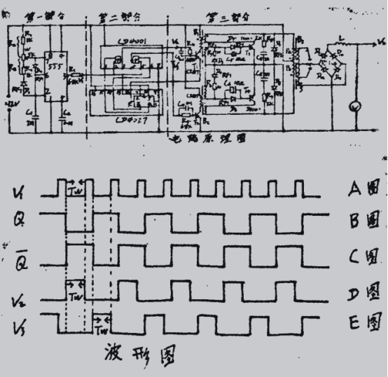 第二部分:这部分是由JK触发器CD4027(只用一个y和四个输入或非门CD4001(只用2个)组成。这部分电路完成脉冲信号的逻辑关系。V作为K触发器的时钟信号。每当时钟信号的下降沿到来时,JK触发器的Q端和Q端电平都将发生反转,如图B和图C。因为或非门的2角和5角信号为V,1角信号为Q.6角信号为Q,咱们晓得或非门只要输人端一起为低电平常.输出才为高电平。所以3角输出波形V如图D.4角输出波形V,如图E,它们的脉冲宽度为Tw。