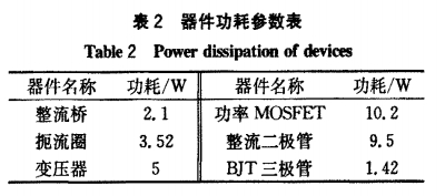 3)功耗参数:本例电源系统的主要发热元件共有16个,电路中主要发热器件各接触面的损耗可由(4)式求得,其中变压器的损耗可分别由文献[3]中的铜损及铁损的计算公式分别求得。本例中将计算得到的各个主要发热元器件的功率损耗值,依照参数类型归类整理,如表2所示。