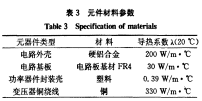 资料参数:该电路中触及的资料包括铝合金、铜、塑料和电路基板资料-FR4。表3为元器件资料的主要参数。
