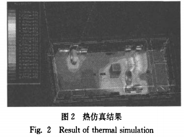 依据主要发热元器件的损耗计算公式,得到各损耗值,将其导入仿真软件;应用Ansoft仿真软件的内部求解器取得实践电路的3D发热模型,如图2所示。从图中能够明晰地看到电路内部及各个元器件上的热量散布状况。依据仿真结果(图2)可知,功率MOSFET上的热量和变压器的热量最高(红色局部),这与从电路理论上剖析求得的这两种器件的功耗(见表2)相吻合。