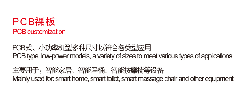PCB式 小功率机型多种尺寸符合各类型应用 主要用于:智能家居、智能马桶、 智能按摩椅等设备